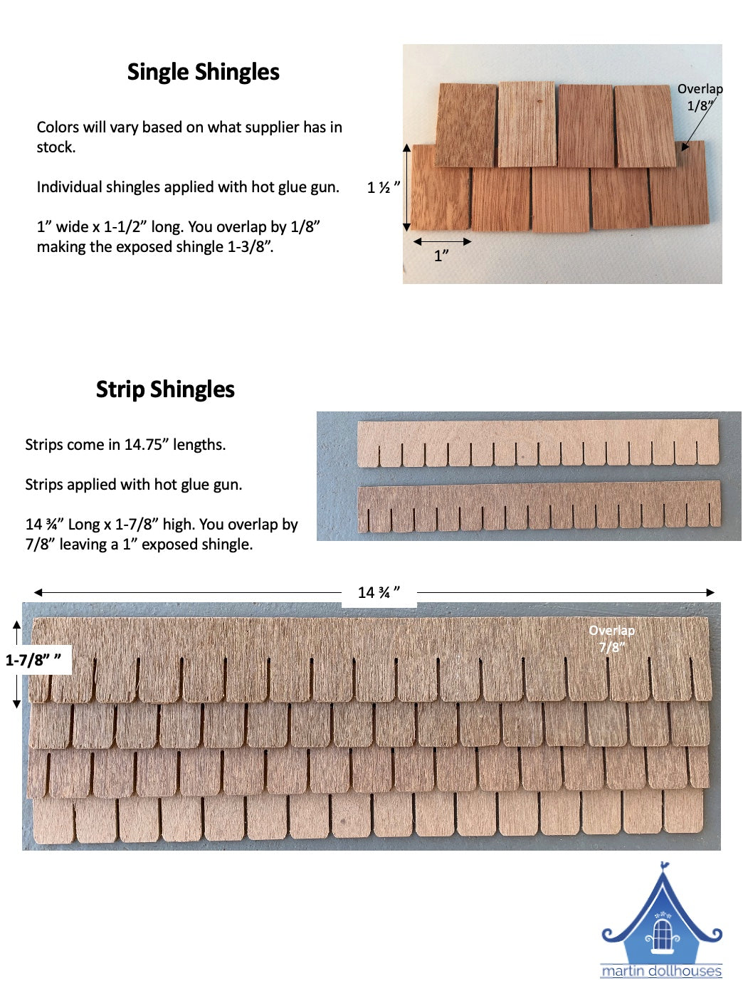 Precut and ready for your creative touch, shingles are the ideal finishing touch for the outside heirloom. Shingles are made of Meranti, a tropical hardwood plywood often called Philippine mahogany. The texture and coloration gives the shingles the appearance of the real thing. In addition to the shingles, when you order a Martin Dollhouse kit, you also get ridge caps for the roof peak. Shingles are easily and permanently applied using a glue gun.